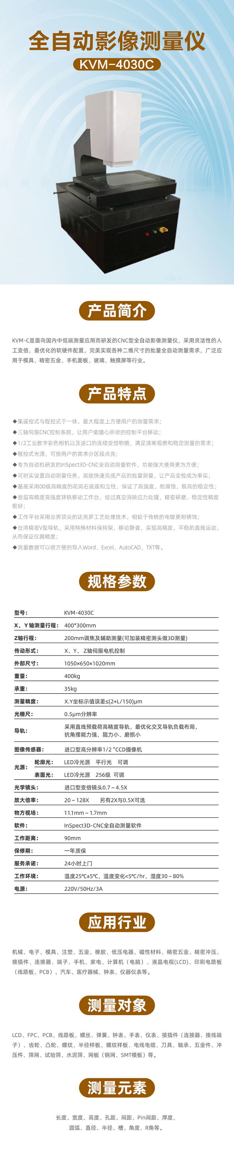 产品描述:1、精准闪测,一触即发;2、大口径高景深,实现全视野范围成像清晰,无畸变;3、自动图像匹配功能,测量工件可任意摆放,无需定位夹具,无需焦点4、调节,无需载物台手动操作;5、可实现测量工件多个位置测量,增加测量尺寸,也不会多耗费测量时间;6、多个工件可